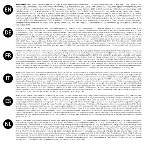 Het heeft een kenmerkende kleur die gaat van roze naar paarsrood voor een deel mager en helder uiterlijk van vet. Het heeft een delicate, niet erg zoute smaak en een aangenaam en karakteristiek aroma. De textuur is homogeen en niet erg vezelig. Het staat ook bij velen bekend als “jamón serrano”. De Serrano ham is een product dat wordt gemaakt van de beste stukken varkensvlees die zijn geselecteerd om na het zout- en rijpingsproces een volledig natuurlijk product te verkrijgen en zo het beste aroma en de beste smaak te verkrijgen. De extra salami is een halfharde salami gemaakt van mager varkensvlees en gekruid met zout en peper. De Duroc varkenslende worden gemaakt met natuurlijke ingrediënten: mager varkensvlees, La Vera paprika, knoflook en zout. Varkenslende duroc is het resultaat van een lang en langzaam rijpingsproces, geleidelijk gerijpt tot het zijn eigenaardige roze kleur, delicaat aroma en licht zoute smaak bereikt. Het heeft een stevige, homogene en compacte consistentie. De chorizo wordt gemaakt met natuurlijke ingrediënten: mager varkensvlees, La Vera paprika, knoflook en zout.